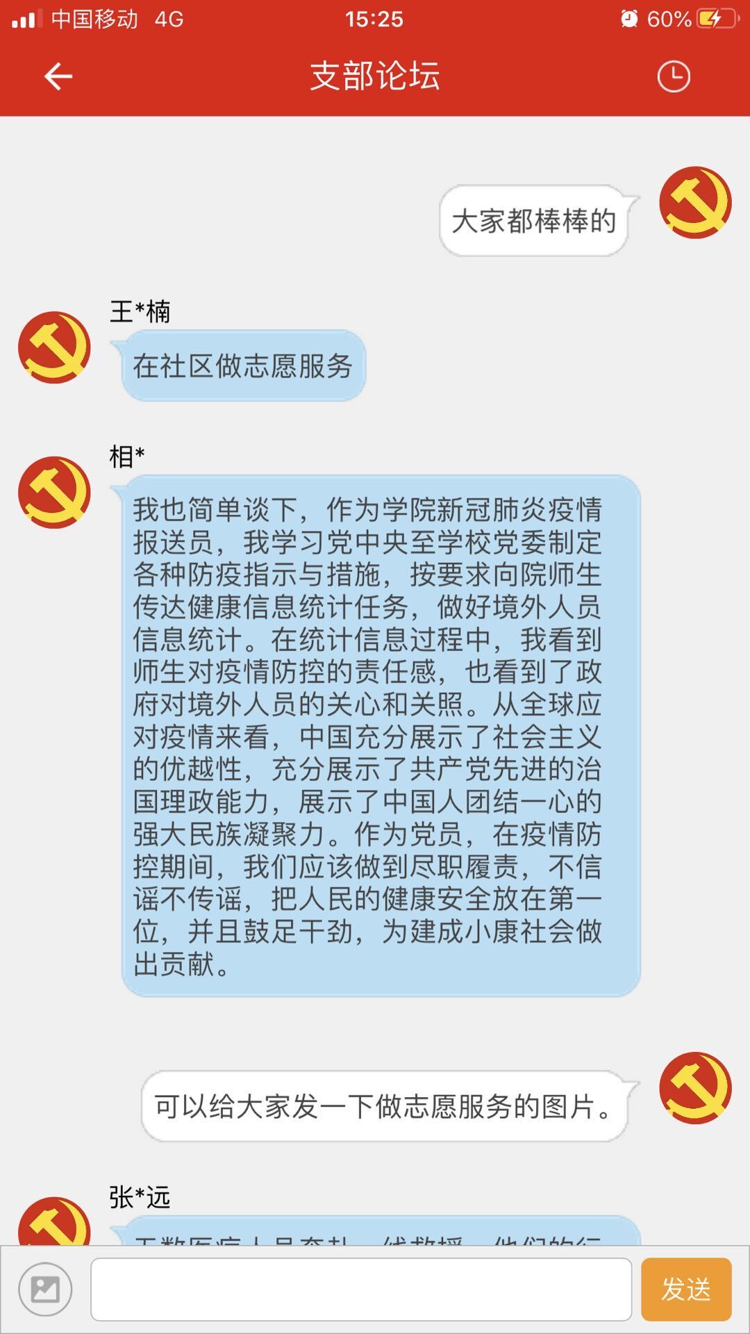 此次论坛开展之前,孙哲通过“灯塔大课堂”组织支部成员进行线上学习,全体成员积极开展学习并记录心得体会。讨论活动开始,孙哲在论坛空间发布讨论的内容以及要求,全体成员积极参与讨论,踊跃发言,大多数同志能够结合自身实际发表自己的看法。相同志作为公司新冠肺炎疫情报送员,他认为作为党员,在疫情防控期间,我们应该做到尽职履责,不信谣不传谣,鼓足干劲,为建成小康社会做出贡献。王同志认为此次疫情更加体现出基层党员干部的重要性,上传下达,党中央的决策部署靠他们落地生根,作为员工党员也要向他们看齐。杨同志认为员工党员及时做好相关宣传非常有必要……支部成员纷纷发表意见,相互交流。大家表示疫情还未结束,作为员工党员我们不应放松学习,要时刻保持清醒的头脑,关注疫情防护的知识,做好党的一面旗帜。