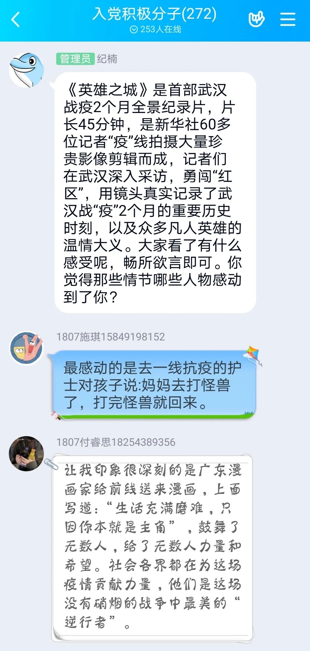 在纪楠的自我介绍下,活动慢慢地拉开了帷幕。本次党课学习,根据公司党委要求,由纪楠组织观看视频《英雄之城》。同学们积极地将自己观看视频的照片发放到活动群中。不仅如此,同学们更是在观看完视频后,借鲜活生动的语言抒发自己观看后的感悟。郭召伟字里行间表达出习近平同志为核心的党中央始终把人民群众生命安全和身体健康放在第一位,重点支持疫情防控工作的认识;李宝田一字一言间说明了武汉人民用同心协力、英勇奋斗的实际行动,彰显了中华民族同舟共济、守望相助的家国情怀,展现出了不怕牺牲、勇于担当的、顾全大局、甘于奉献的精神的深刻情感;纪楠强调抗击疫情,不仅仅是党委、政府和医护人员的事,每个人都不能置身事外,每个人都是抗击疫情链条上的一环,都有自己的防护职责和战斗任务,关键时刻,只有相互协作,建立起政府、社会、个人各方休戚与共、有机互动的命运共同体,才能共克时艰,夺取最后胜利。活动就在同学们的热烈表达中缓缓落下帷幕。