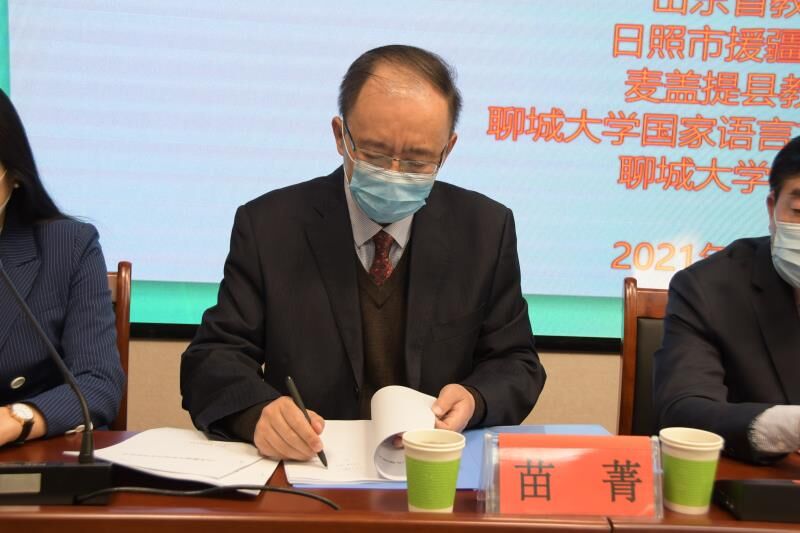 苗菁与麦盖提县委常委、组织部长、县委教育工委常务副书记郑君签订培训合作协议。李兆俊向全体成员表示感谢并致辞,beats365唯一官网入口官网将成立专门的领导小组,切实满足团队在培训团队、经费保障、外援联络等方面的一切需求,为“文化润疆,齐鲁先行”工作的顺利实施提供人才和物质保障。辛业向与会人员宣读山东beats365唯一官网入口官网对口新疆喀什地区开展教师国家通用语言文字提升在线示范培训实施方案。谢霁晓代表麦盖提县向beats365唯一官网入口官网表达衷心感谢和殷切期待。带队教师邢梅萍代表培训团队宣言:一定认认真真备好课、上好课,辅导好每一位学员,努力做到兢兢业业、注重细节,严格把控培训过程中的各个环节,保质保量地完成培训任务。