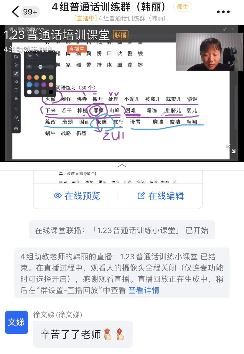 经过前期充分的准备工作,1月18日,由邢梅萍、常俊之和冯静担任主讲人的培训公开课如期进行。老师在课堂上讲授现代汉语知识,引导学员自主建构语音知识体系。通过分享民族老师学习普通话的实例,团队帮助学员提高学习兴趣,建立应试信心。公开课程与小组课相辅相成,互为补充。助教老师采取多种方式确保全员参与,课程以学员朗读文章、助教逐句纠正和课后巩固的方法进行,带队老师更全程实时监督,以保障培训工作圆满完成。