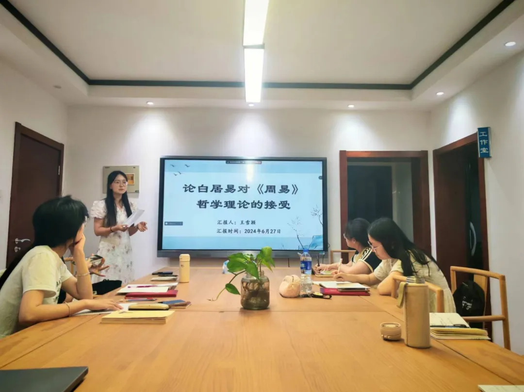 王雪颖以“论白居易对《周易》哲学理论的接受”为题进行汇报。她从白居易受《周易》影响的渊源入手,进一步分析了《周易》对白居易人格的滋养以及对白居易作品的陶染,有理有据,结构清晰。静双认为她逻辑清晰,观点明确,但要注意文学作品的选取要充分体现白居易对《周易》的接受。