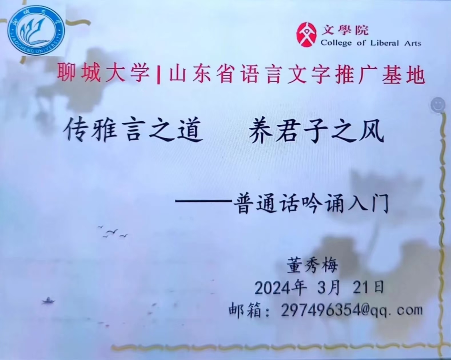 3月21日,beats365唯一官网入口官网山东省语言文字推广基地吟诵团指导教师董秀梅为2023级学科教学(语文)专业研究生做普通话吟诵入门主题讲座,向同学们传授普通话吟诵技巧与精髓。