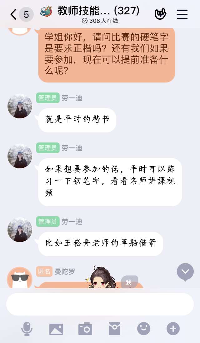 本次交流会分为“经验共享”和“答疑解惑”两个环节,经验分享环节结束后,展开答疑解惑,同学们在评论框中积极地提出自己的问题,学长学姐也十分认真仔细的进行解疑答惑。刘润林指出,大家应该提前准备学习名师教课视频,学习经验以取长补短;同时,更要练好正楷钢笔字。劳一迪引用亦舒《花解语》的一句话“人啊,真的要自己争气,你一做出成绩来,全世界和颜悦色”,鼓励同学们像我们这种普普通通的家庭,普普通通能力的我们,只有不断的努力才能够实现自己想要的生活。