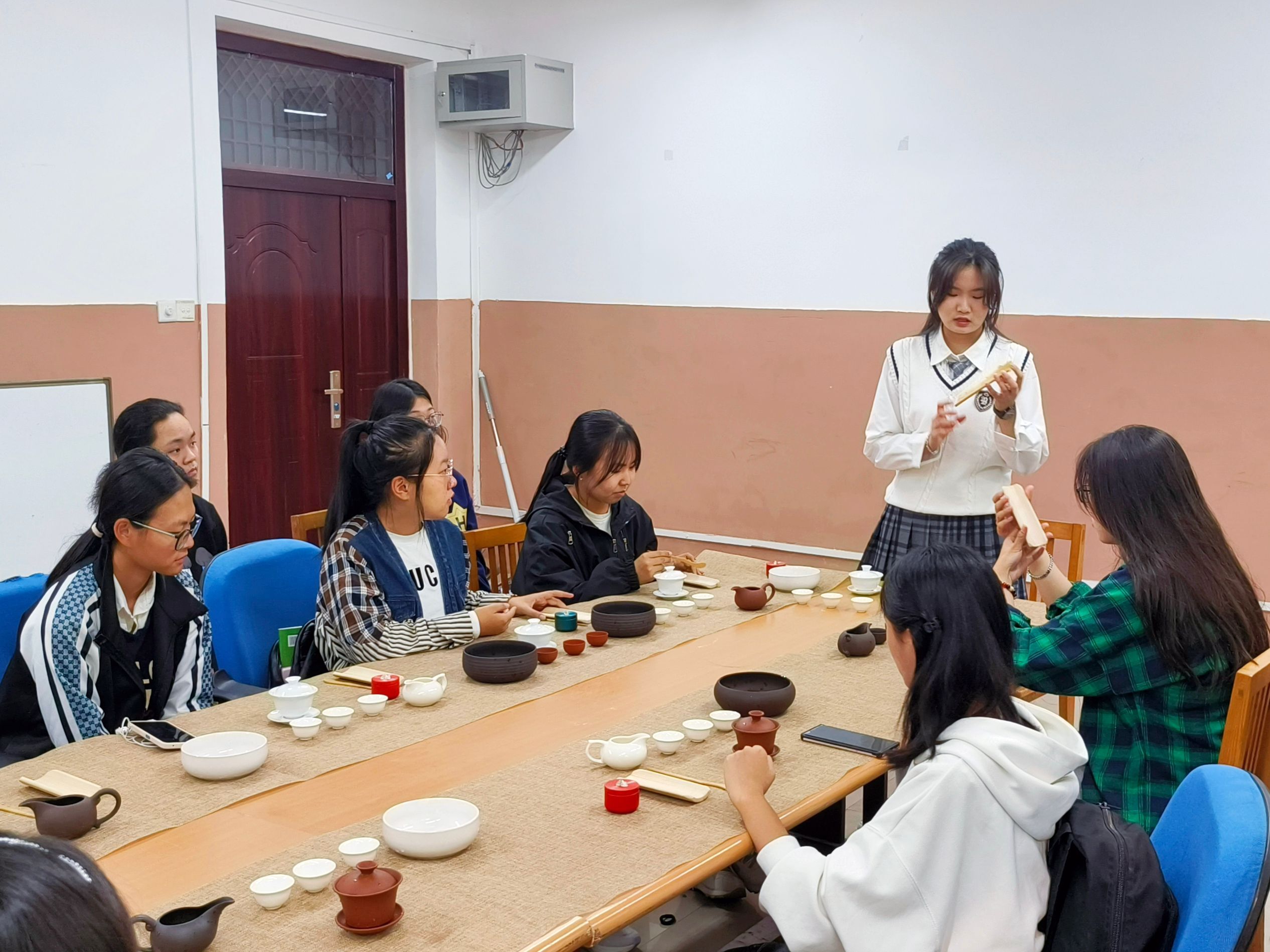 茶艺不仅是一种饮品的制作和品尝技艺,更是一门艺术形式。先锋秘书协会理事长2021级9班曲镜陶同学通过中华传统文化引入中华茶艺的历史,激起同学们对泡茶的兴趣。接着,她向大家简单介绍中国茶叶的起源、分类、不同茶叶冲泡特点以及各类茶具的用法,从洁具温杯到闻香识茶再到茶水冲泡,曲镜陶同学以标准、高超的茶艺手法向在场观众展示中国茶文化的礼仪美德。在演示温杯、摇香、闻香、洗茶、泡茶、出汤、分茶、品茶等环节的过程中,曲镜陶同学仪态端庄、动作优雅,不时为同学们指出泡茶过程中易出现的礼仪问题;同学们则从中感受到茶艺之美、礼仪之美,进而领悟到中国传统文化的精髓。在讲述完茶的基本知识及茶艺技巧后,曲镜陶同学鼓励同学们多多练习,并根据茶艺操作中出现的问题予以指导。最后,大家纷纷开启茶艺之旅。刚泡上的头道茶,沸水一沏,茶叶似入水活鱼,上下翻腾,几经沉浮,活动室顿时茶香四溢,沁人心脾。活动现场亲密互动、氛围浓厚,大家边练边品边交流,在茶香的熏陶中感受传统茶艺之道。