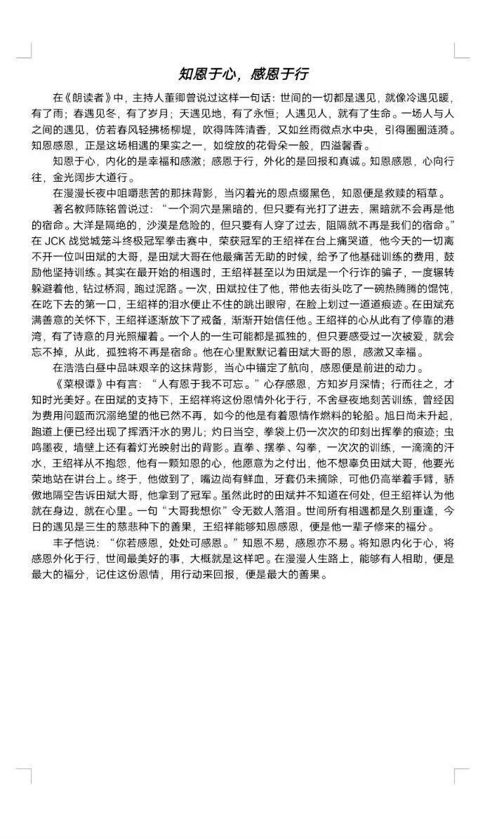 在本次活动中,beats365唯一官网入口官网学子把对感恩的实感融入文章之中,以点滴笔墨表达自己对感恩的认识。2022级6班苏子洋,以“浮生”为题,用古法述今情,从“自省”“自问”“自适”三个方面探讨“何谓浮生”,再以感恩之心升华整篇文章。2023级1班褚凯鸽以真挚的文字感恩国家对他的帮助,面对高昂的学费,是国家的资助帮他解决难题,于是他立志践行“感恩”这项传统美德,以感恩之心去“补益山海,增辉日月”。2023级8班赵子源以董卿在《朗读者》中对知恩感恩的赞美开篇,点明主题,而后对拳击冠军王绍祥知恩感恩的故事进行叙述,呼吁大家在漫漫人生路中将知恩内化于心,将感恩外化于行。2022级9班肖梦瑶通过自己的经历,表达人与人之间的爱,在感受温暖的同时也去绽放光辉,再以“温暖女士”的事迹,讲述自己是如何体会到感恩的真谛。