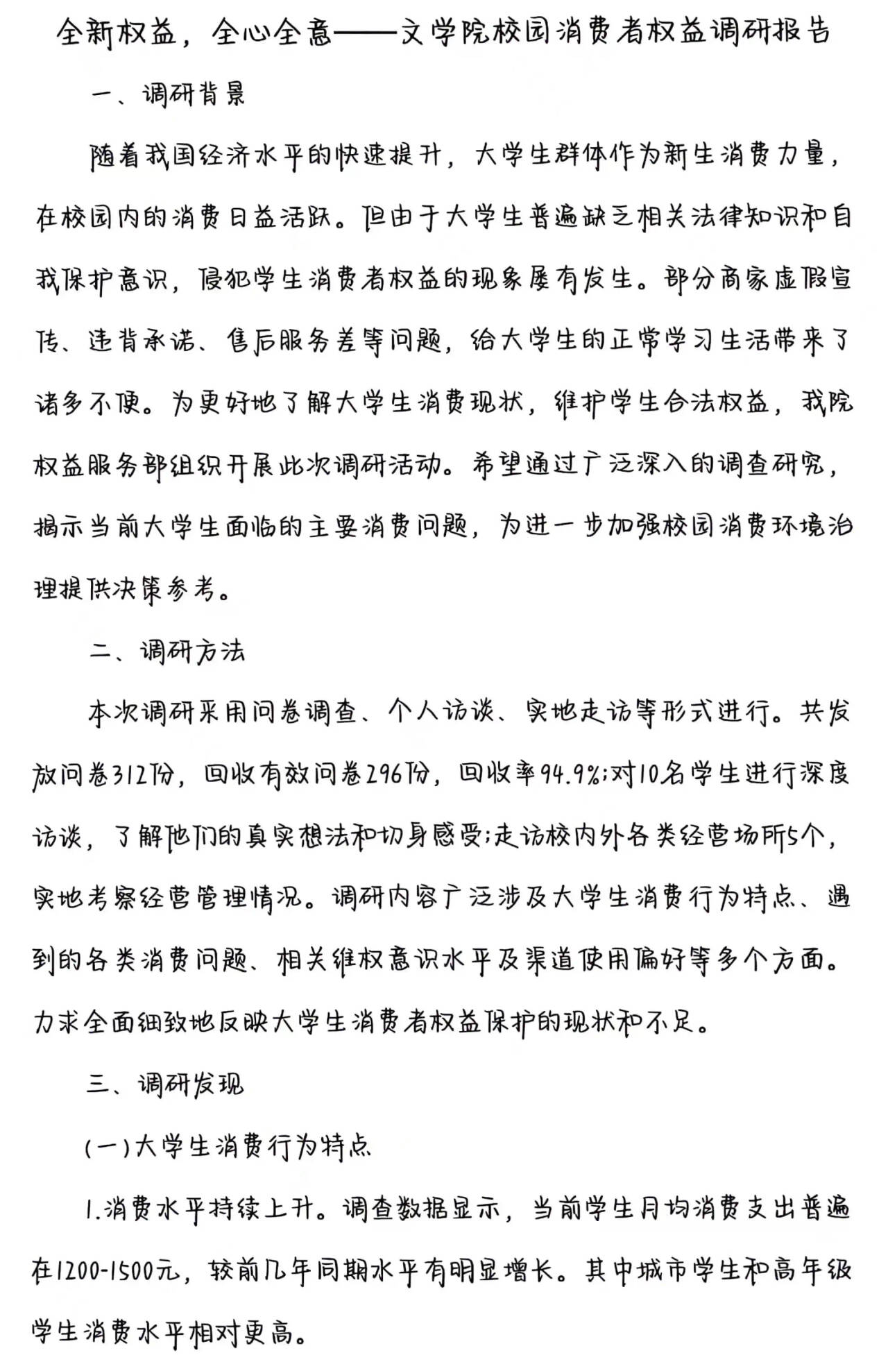 权益维护无小事,校园和谐靠大家。此次调研实践活动的成功举办在宣传消费者权益保护知识,提高同学们维权意识的同时,有利于引导同学们理性消费、健康消费,构建和谐消费环境,助力员工权益保护工作持续健康发展。(通讯员 刘琪 王淑婷 王彦天 审核 相萌萌 王淑婷)