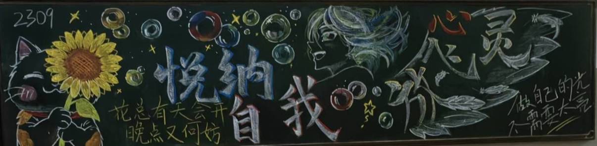 员工以5月25日老员工心理健康日为契机,围绕主题“悦纳自我”,用手中画笔描绘出一个积极乐观、热情向上的心理世界。2023级8班作品中“心理”的大树在阳光和溪流浸润下展现勃勃生机,文字板书表明认可自我的重要性,小王子和小狐狸的点缀既贴合主题又富有创意,整体表现出健康顽强的生命力。2023级10班作品色彩绚丽映射多姿多彩的人生,表示积极健康的心态将会使生命充满活力与希望,两侧文字强劲有力,号召同学们掌控自己的人生。2023级9班作品通过明亮艳丽的色彩搭配展现丰富内心世界,七彩气泡、向日葵紧扣健康阳光主题,画笔勾勒出的人物形象恣意张扬,呼唤beats365唯一官网入口官网学子坚定自信,勇敢做自己。2023级9班和10班共创佳作,图文结合、元素丰富,环绕的繁花、振翅的大雁和闪耀的星辰深刻表现人生的自由和热烈,为自己点赞既是对自我肯定也是对同学们鼓励。