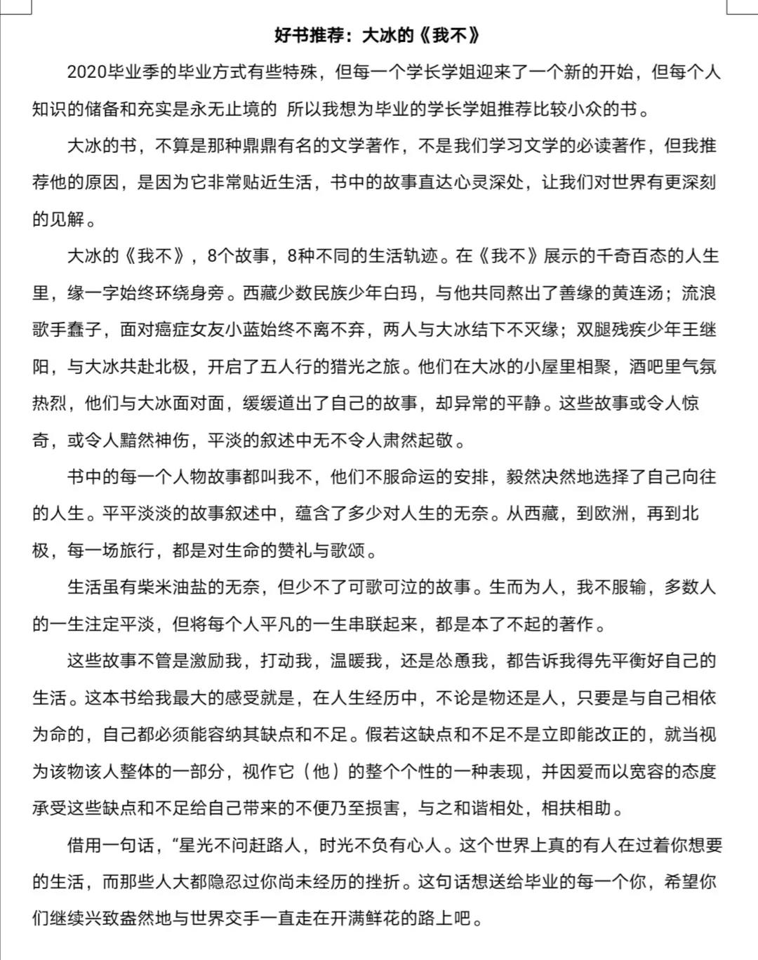 本次活动以推荐稿的形式进行,参赛者各抒己意,向毕业生推荐自己最心爱的书籍,并对即将毕业的他们送出最诚挚的祝福。林晓瑜推荐的《我不》中的人物毅然地选择了自己向往的人生,在看似平淡的故事叙述中,蕴含了对生命的赞礼与歌颂。刘美玉推荐的《活着》一书中的徐福贵虽然一生坎坷,却仍然活得像个斗士,令人肃然起敬。董晓丹推荐的《傲慢与偏见》通过一个艰难却圆满的故事道出勿固执己见,看待人和事要一分为二的道理。张琦琦带来的《月亮与六便士》提示大家追逐梦想的时候不要迷失本心,都要做好自己,要永葆追求生活的激情,不轻言放弃。刘昊睿推荐的《霸王别姬》则祝愿毕业生也能在自己的舞台上发光,寻找到愿为之倾注全部的情怀。