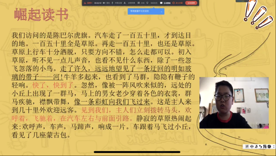 本次讲课的内容是以景物描写为核心的作文课,几位老师都用自己特有的方式为小员工们答疑解惑,并留下深刻的印象。2018级2班的唐天云以其诙谐幽默的语言风格吸引着小员工们专心上课,在收获作文知识之余也了解到许多文学趣事,于学习中感悟喜悦;大家对于展示自我非常积极,在2018级5班胡雪婷和2019级5班方雨晴的课上就有两位同学多次主动与老师连麦,声情并茂的朗读课文,向老师提出自己的疑惑,两位老师也由浅入深、循序渐进的为他们解答问题;小孩子是最有想象力的,2019级1班刘雨荷在讲解“比喻、拟人”的修辞手法时鼓励同学们活学活用,其中张祥燕所说的“静夜中,只有那天上的星星窃窃私语”意境幽美,得到老师和同学的称赞。本次网上支教不仅是老师给员工传道授业,更是朋友之间的友好交流,响起的下课铃带来的不是结束,而是浓浓的不舍。