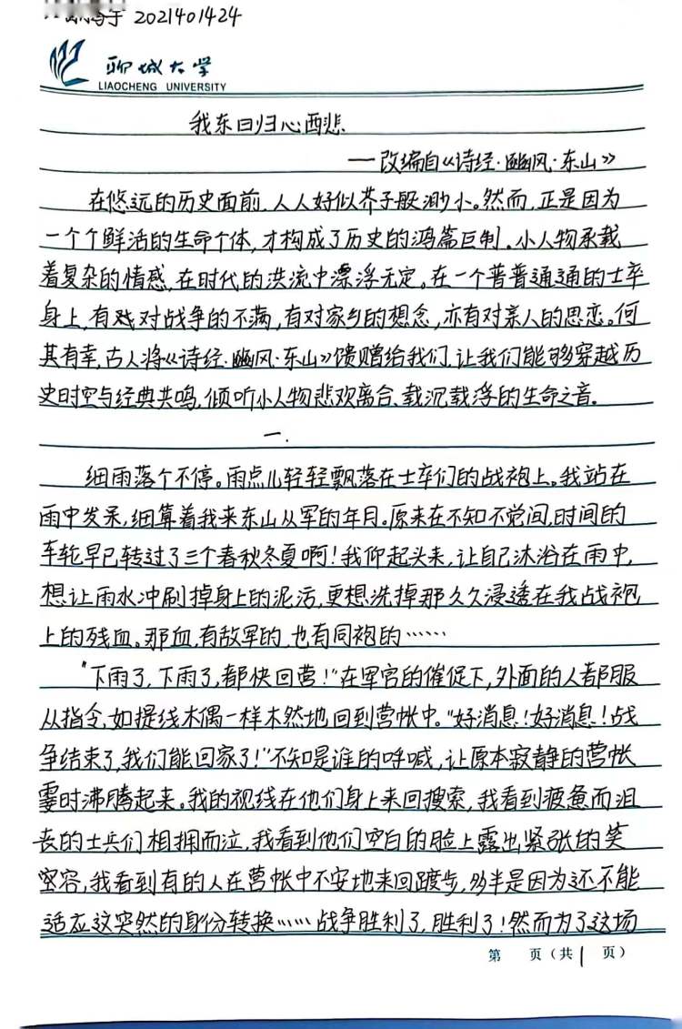 旧篇注新思,妙笔出新彩。同学们承旧经典之魂,焕新时代之彩,纸页之间大展奇想。2022级4班的王文炫在经典寓言故事《愚公移山》的基础上构造出全新结局,古代与现代时空交融,展开一场跨时代的对话。时光飞逝,科技助力移山难关,斗转星移,愚公精神熠熠未改。历史文化与旅游公司2022级1班的吕婕以《诗经》中的经典篇目《氓》为基础,把原本悲惨凄凉的现实故事改编为一场梦境,以警醒原本深陷泥潭之中的女主人公,并将新时代女性敢于反抗,独立自强的精神与其形象融合,赋予旧故事新生命。2021级1班的潘腾宇选择《诗经》中的《东风》一篇,细致入微地刻画出远征战士在归乡之路上的所思所想,聚焦小人物,描绘大历史,将战争之下人民所承受的苦难展现的淋漓尽致。