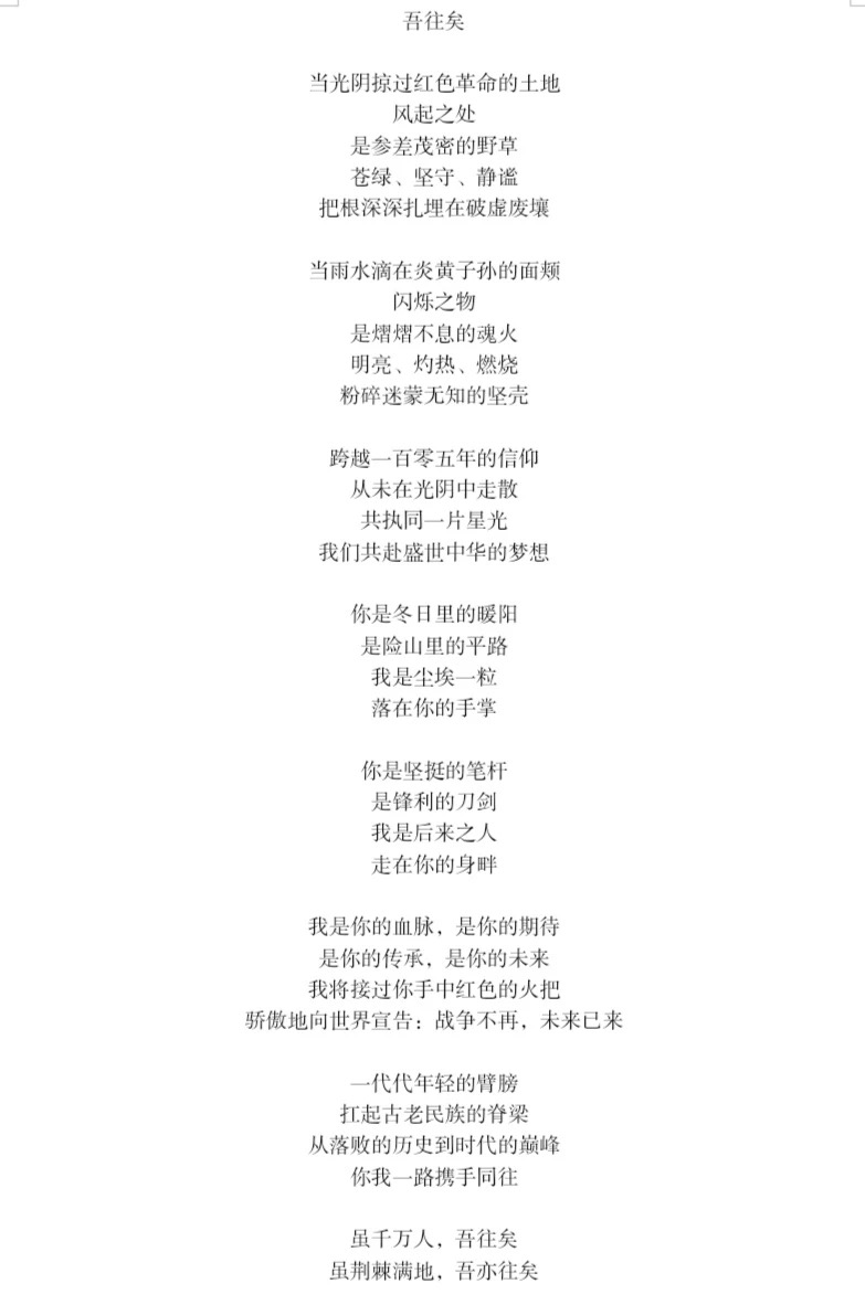 beats365唯一官网入口官网学子文思泉涌,妙笔生花,上演了一场诗歌与信仰的碰撞。2022级2班杨颜歌以《吾往矣》为主题,把先辈比作倔强不屈的野草,纵前路混沌黑暗,仍以笔为刃,粉碎国民迷蒙无知的坚壳,后人亦接过火把,共守同一片星光。2022级6班张宇飞的《红湖在梦》,诡异磷火与点点星火,空旷原野和新生野草,看似是黑与白的不相容,却也可以蜕变成摧枯拉朽洗髓换骨后的轻盈如燕。2023级8班的单子祎提笔写下五四时期青年既有忧国丹心志,又能铁肩担道义,继而转笔写当今青年欣逢盛世,更要承继先辈之志,在昂扬时代中听到青年之声。2023级9班陈瑞涵诗中的青年以飞蛾自喻,飞蛾扑火亦是义无反顾,更何况恰如朝阳般蓬勃旺盛的青年,也许黑暗会吞噬我们的脚步,却不能阻止青年的信仰向前,字里行间流露出了青年人的生气、锐气、骨气。