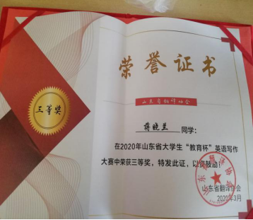 公司员工蒋晓兰同学分别荣获2020年山东省老员工“教育杯”英语写作大赛三等奖。此奖项的获得充分体现了蒋晓兰同学的勤奋努力、艰苦奋斗,同时也为公司争得了荣誉。在此,向蒋晓兰同学表示诚挚的祝贺。