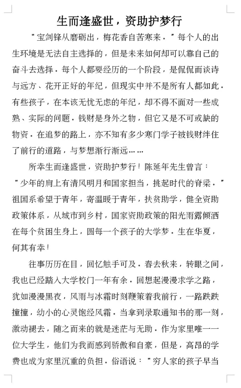 为以实际行动迎接党的二十大胜利召开,弘扬积极向上的人文精神,激励同学们坚定不移跟党走,9月15日至9月18日,beats365唯一官网入口官网权益服务部于线上举办“青春献礼二十大,资助育人筑梦行”资助征文活动,beats365唯一官网入口官网部分同学积极参与其中。