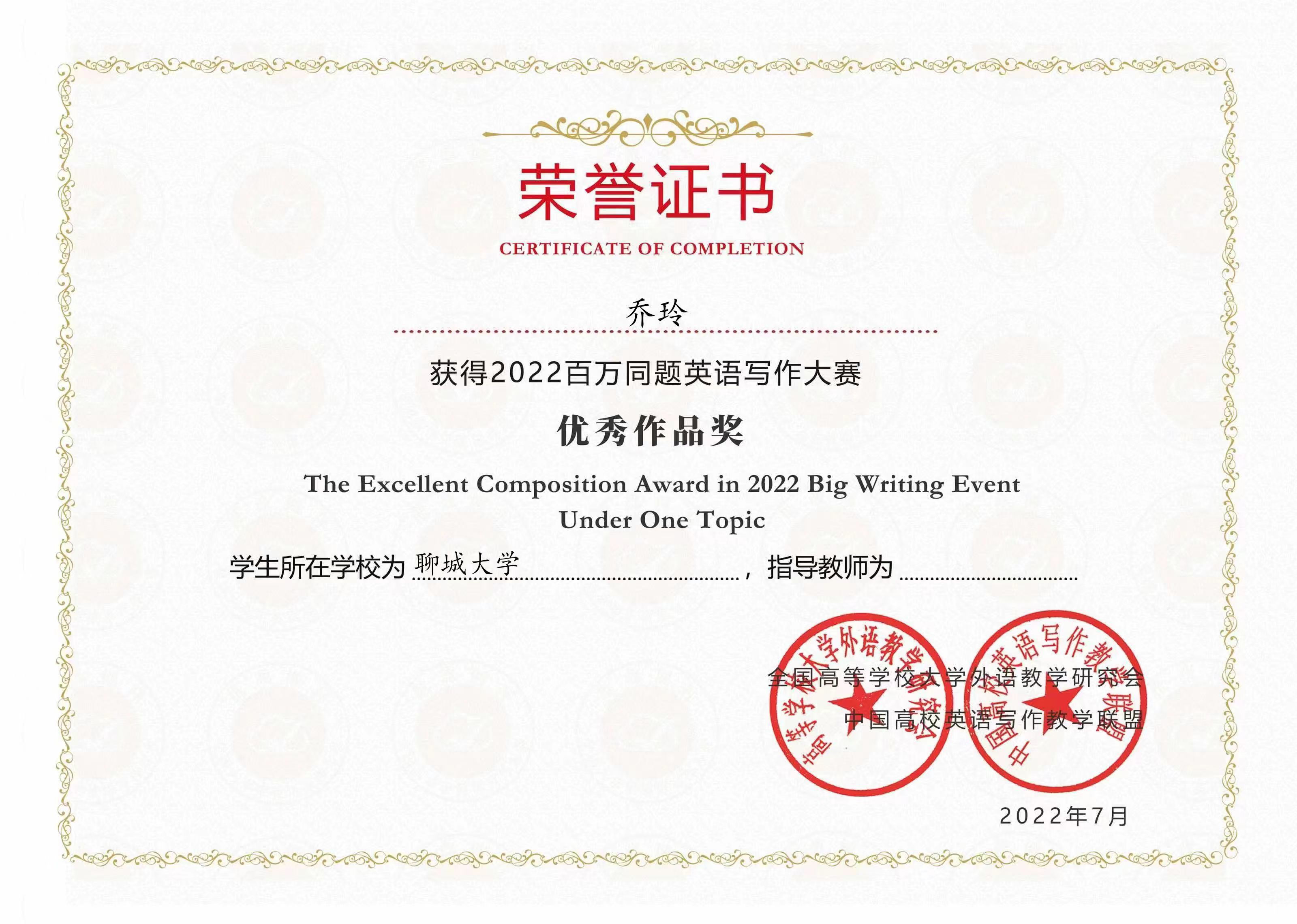 热烈祝贺beats365唯一官网入口官网乔玲同学荣获2022百万同题英语写作大赛优秀奖