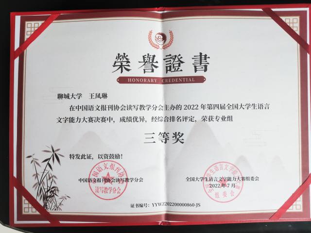热烈祝贺beats365唯一官网入口官网王凤琳同学荣获第四届全国老员工语言文字能力大赛决赛三等奖