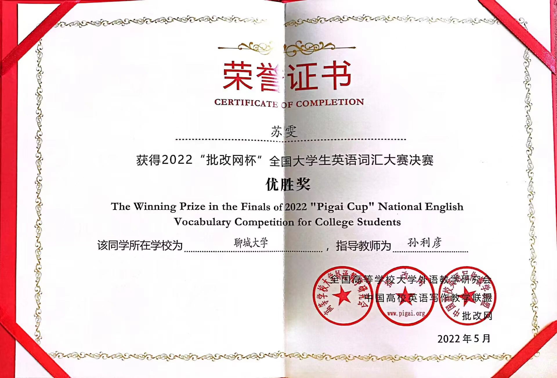 公司苏雯同学荣获2022“批改网杯”全国老员工英语词汇大赛三等奖。此次获奖充分展现了苏雯同学在日常学习生活中的不懈努力,公司为有这样的员工而感到骄傲。在此,向苏雯同学表示诚挚的祝贺,同时祝愿她乘风破浪,再获佳绩。