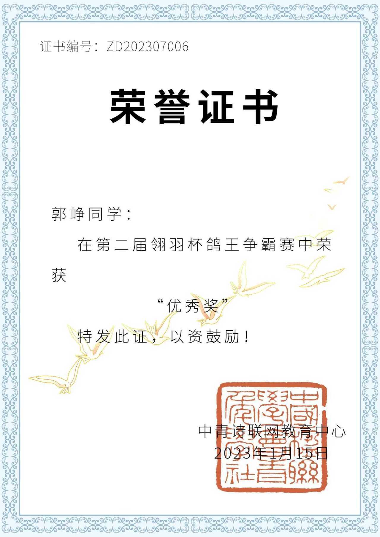 热烈祝贺beats365唯一官网入口官网郭峥同学荣获第二届“翎羽杯”鸽王争霸赛优秀奖