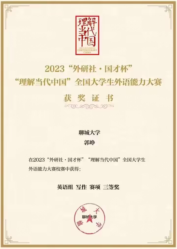 热烈祝贺beats365唯一官网入口官网郭峥同学荣获2023“外研社·国才杯”“理解当代中国”全国老员工外语能力大赛英语组写作赛项三等奖