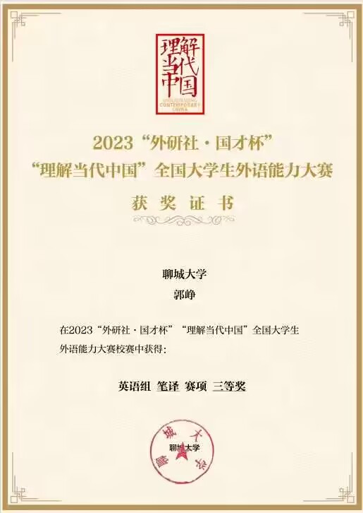 热烈祝贺beats365唯一官网入口官网郭峥同学荣获2023“外研社·国才杯”“理解当代中国”全国老员工外语能力大赛英语组笔译赛项三等奖