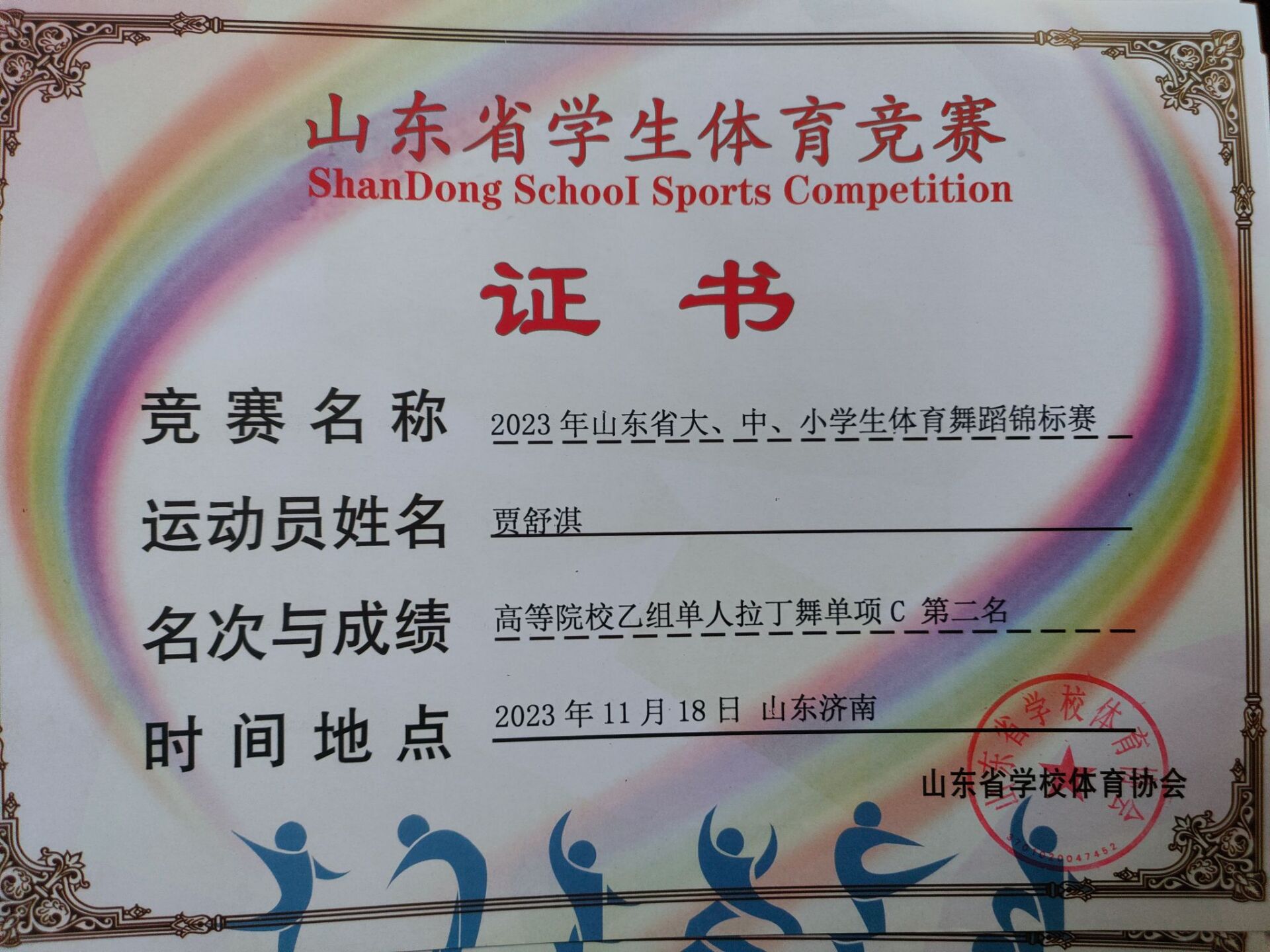 热烈祝贺beats365唯一官网入口官网贾舒淇同学荣获“2023年山东省大、中、小员工体育舞蹈锦标赛”高等院校乙组单人拉丁舞单项C第二名