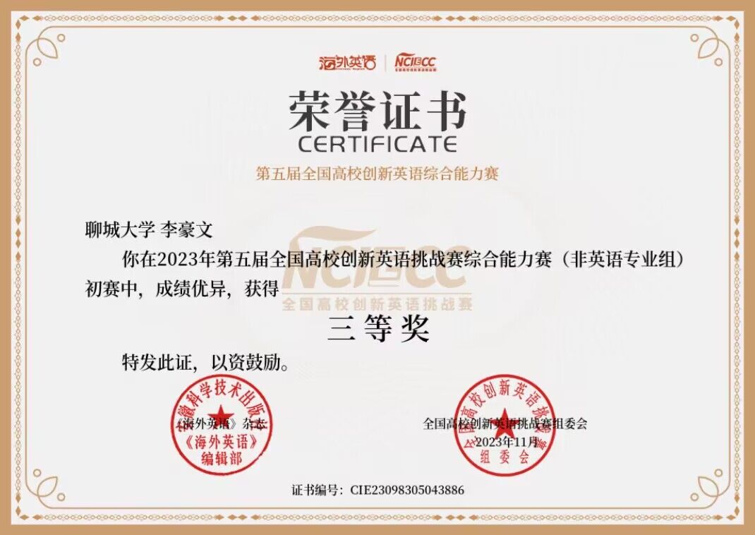 热烈祝贺beats365唯一官网入口官网李豪文荣获“2023年第五届全国高校创新英语挑战赛综合能力赛(非英语专业组)初赛”三等奖
