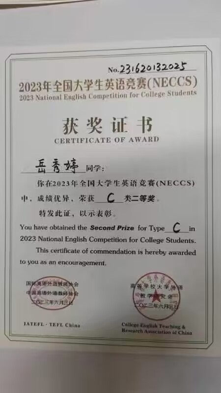 热烈祝贺beats365唯一官网入口官网岳秀婷同学荣获“NECCS”C类二等奖
