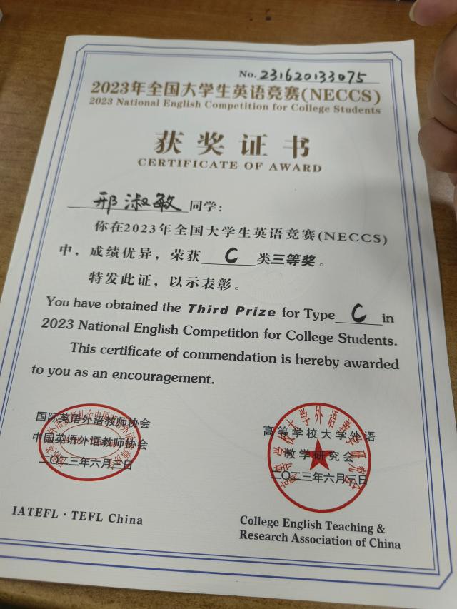 热烈祝贺beats365唯一官网入口官网邢淑敏同学荣获“NECCS”C类三等奖