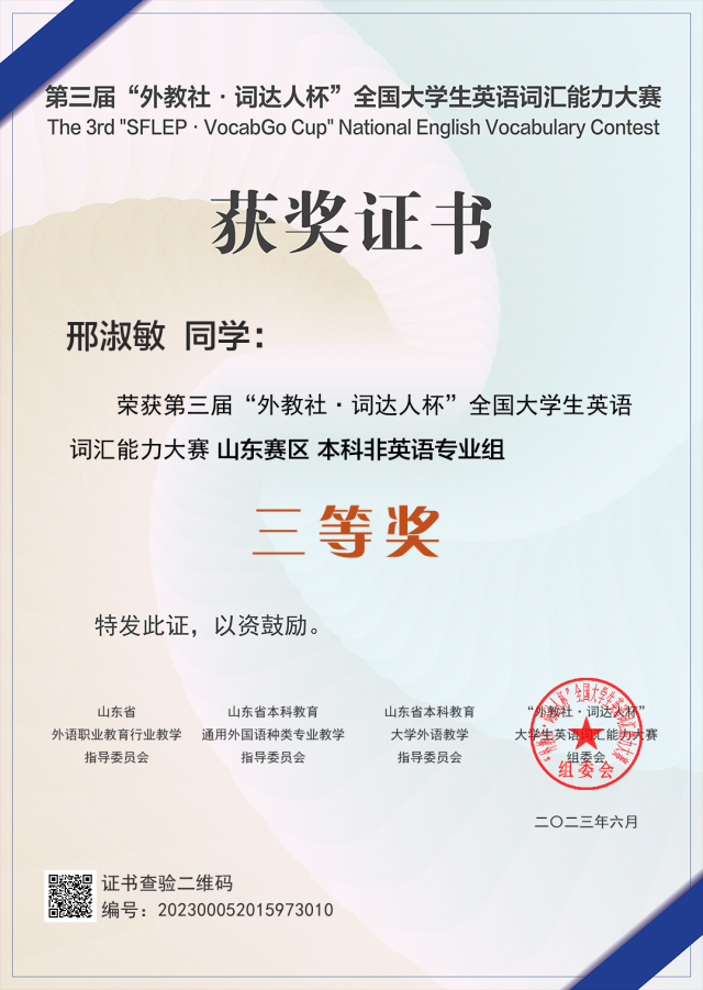 热烈祝贺beats365唯一官网入口官网邢淑敏同学荣获第三届“外教社·词达人杯”全国老员工英语词汇能力大赛山东赛区本科非英语专业组三等奖