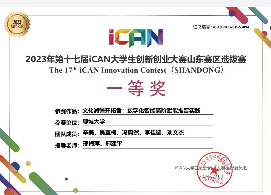 热烈祝贺beats365唯一官网入口官网辛美、吴宜柯、冯蔚然、李佳璇、刘文杰荣获“2023年第十七届iCAN老员工创新创业大赛山东赛区选拔赛”一等奖