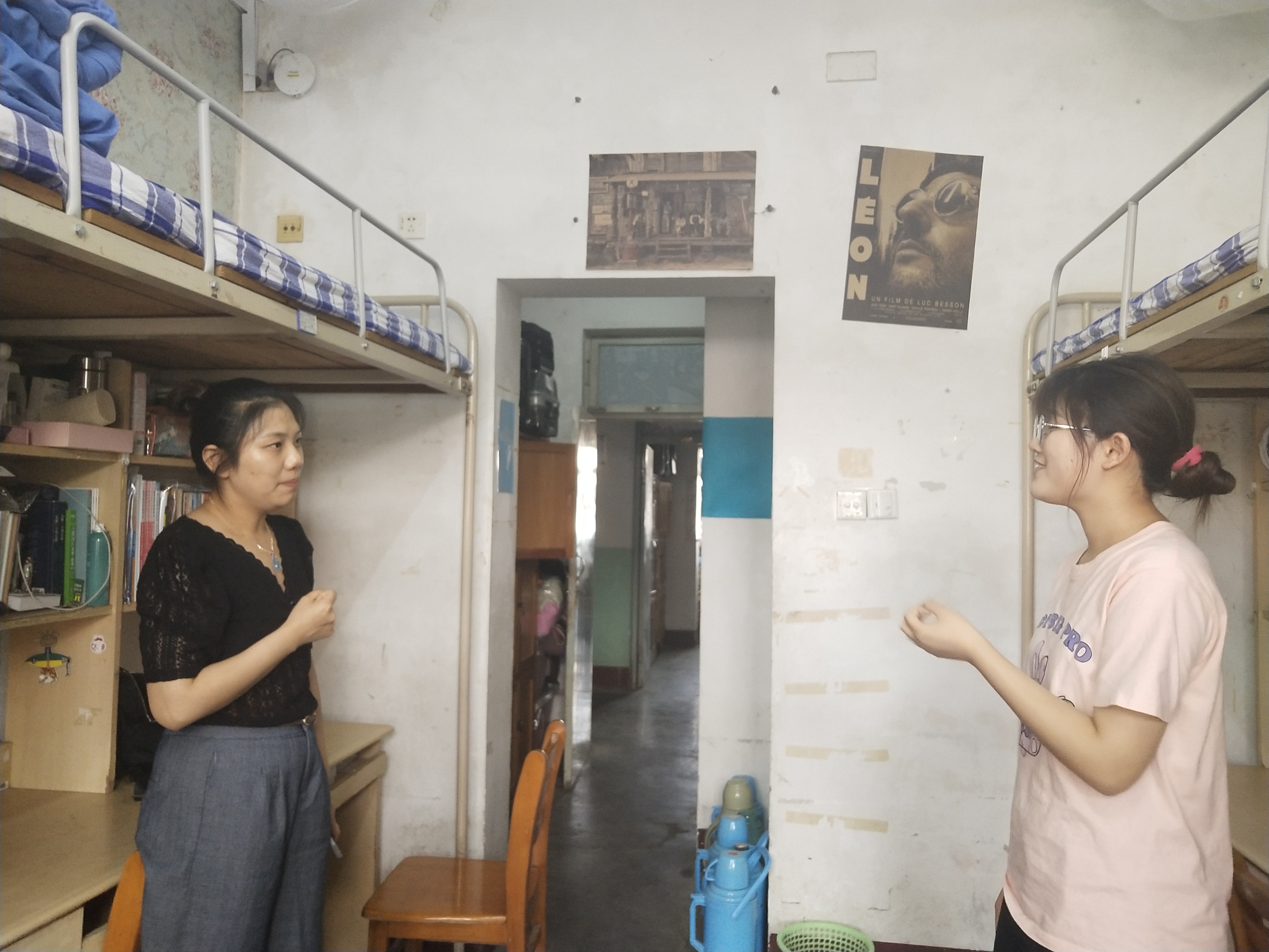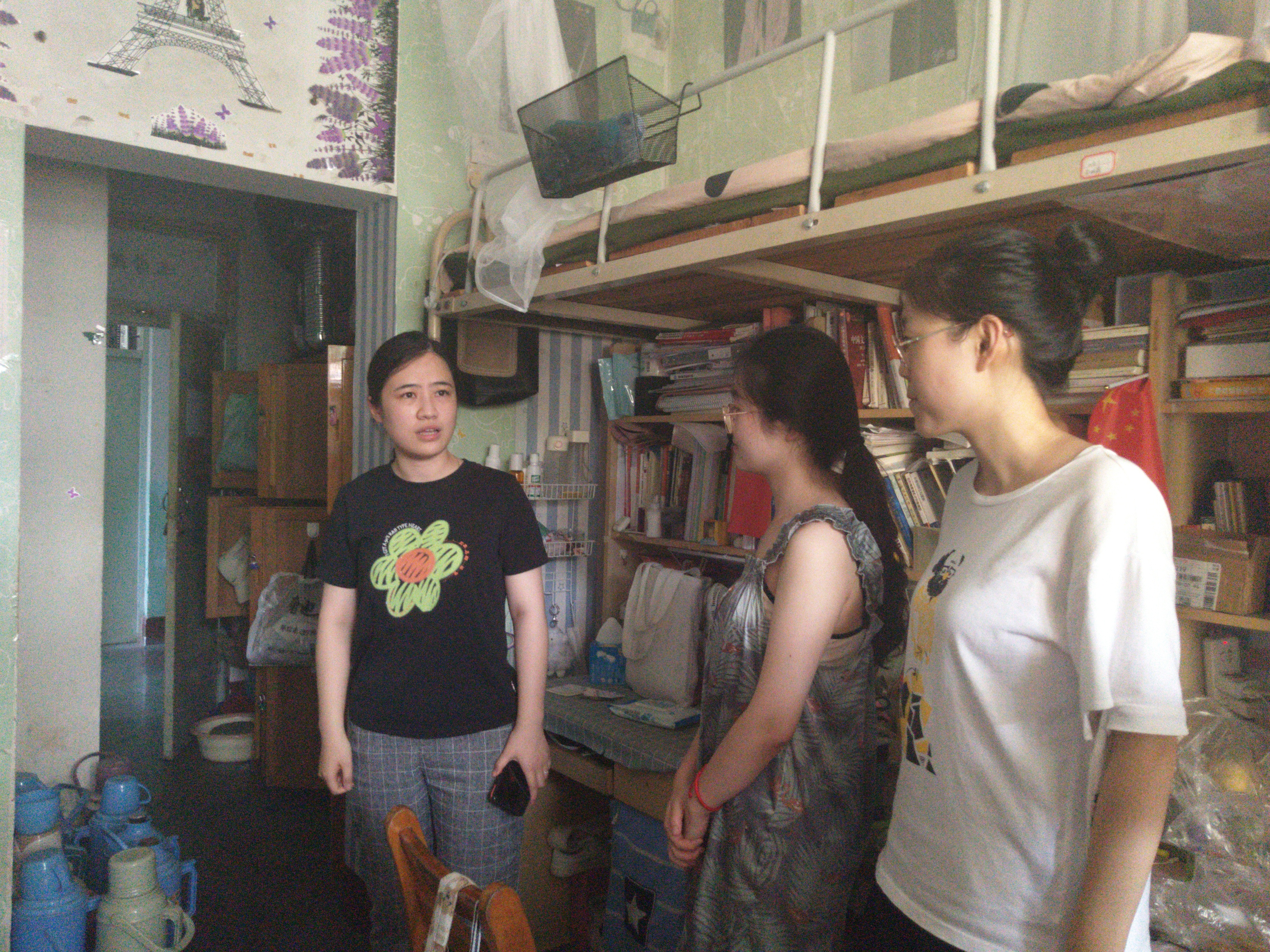 走访期间,孙哲、胡玥和贾瑞清前往参观各个年级的女生宿舍。教师们结合宿舍实际,全面排查安全隐患,并认真检查宿舍卫生,主要针对炎热的夏季,教师们细致地询问同学们宿舍生活上遇到的问题,并及时给予疏导和解决,特别针对同学们关心的安装空调问题作出肯定回应,走访途中,对于整洁卫生、氛围良好的宿舍老师们提出表扬。同时,走访老师也关心着同学们的学习生活,特意向即将进行英语四六级考试的大二员工表示鼓励和宽慰,让她们放平心态,在宿舍里营造出良好的学习氛围,专心备考,并且不厌其烦地解答员工的困惑。老师们不忘看望即将毕业的大四员工,对她们的考研、考公结果以及毕业去向进行关切的询问,在给予她们毕业祝福的同时嘱咐她们要放开手脚去闯,常回家看看。