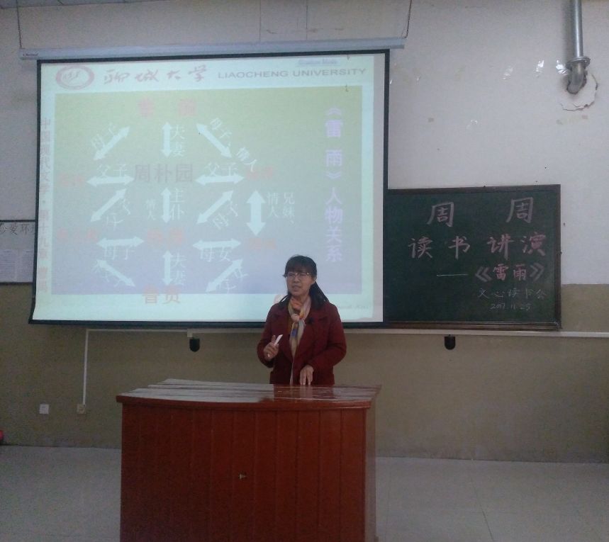 读书讲演环节中,王代杰以繁漪为例,向同学们讲述封建社会对女性的束缚;李敏则从青少年和阶级矛盾的角度思考,呼吁同学们大胆地追求自由与平等。最后,隋清娥从话剧台词、演讲表情等方面对同学们提出表扬后,与同学们就《雷雨》的主人公问题进行讨论,并从阶级关系、血缘关系与伦理关系三方面分析周朴园和繁漪的性格特点及产生悲剧的原因。同学们纷纷表示,他们听到老师的点评与讲解后,对《雷雨》有了更加丰富的了解。