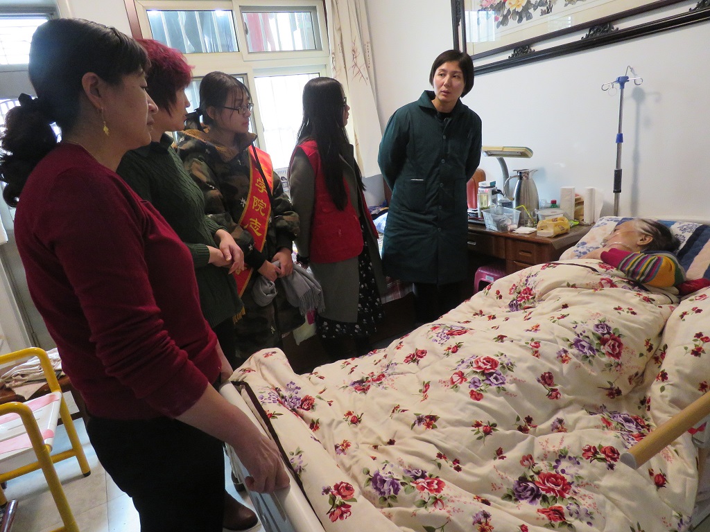 随后,服务队跟随宁养院职工姚荣到病人家中出诊,询问了病人的身体状况后,队员们与病人细声交谈,像亲人一般说着家常,两双温暖的手握在一起,病人脸上露出会心的笑容。