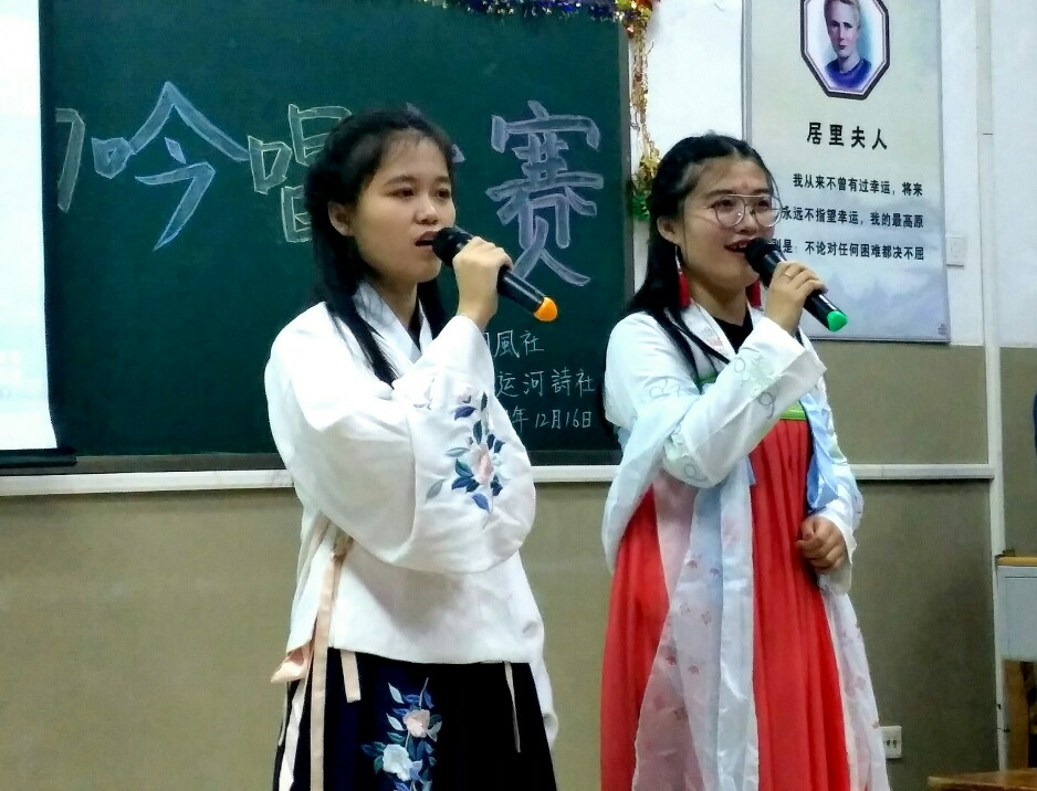 本次比赛分为个人赛和团体赛。参赛选手自信满满,尽展青春风采,现场掌声连连。“打起绣帘,风里扬着这漫天的落红无依,惹得满目愁楚。那个染着愁绪的女子,在花下,轻诵着一首葬花吟”封媛媛的一首《葬花吟》,配以优美的舞姿,将观众带入黛玉葬花的情境之中,“人生的功名利禄不过是转瞬即逝,世间纷纷扰扰,不如你惊鸿一瞥。”吴宛真带来的歌曲《红昭愿》,感情饱满,唱出了古代女子的不幸,获得了评委及现场观众的一致好评。人生是一场旅程,我们经历了几次轮回,才换来这个旅程,不妨大胆一些,爱一个人,攀一座山,追一个梦,由聂文琪和王艺璇组成的椿湫红蝎队演唱歌曲《大鱼》,她们身着古装,自信十足,以婉转动听的歌声,赢得现场观众的热烈掌声。最后,比赛在参赛人员与评委的合影中圆满结束。