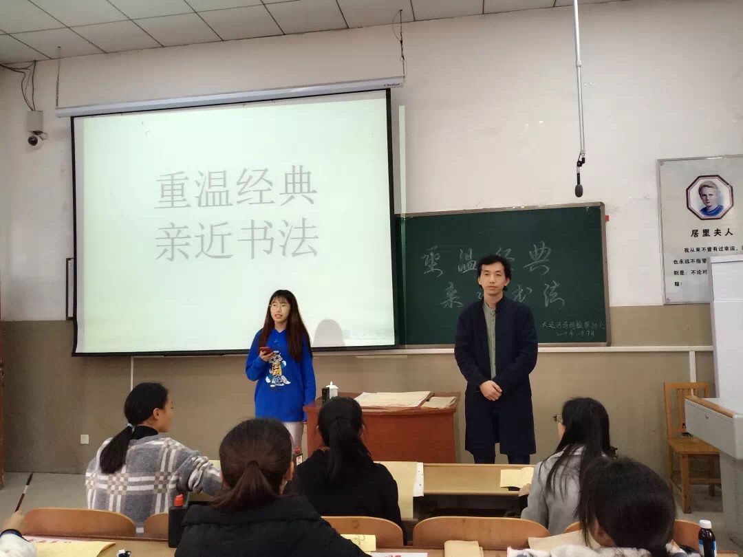 在主持人姜頔对刘昆以及本次讲座进行介绍后,活动正式拉开序幕。刘昆以书法艺术的历史演变为媒介,生动具体呈现出书法文化在不同历史时期的多样性,同时向同学们介绍隶书、行书、楷书、草书的艺术特点以及名家大师,并指出临摹字帖是学习书法最有效的方式。刘昆在讲解之余进行现场书写,通过对“永”字的详细分解讲解书法笔画,用具体的实践演示为同学们答疑解惑。同学们在老师的指导后开始自主练习,期间有姜頔等人给予指导,整个过程积极互动,现场气氛融洽。