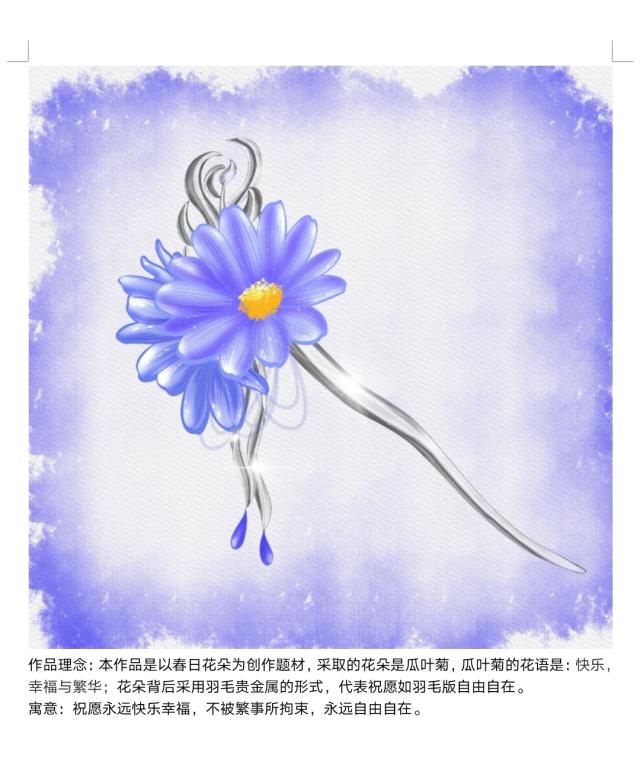 彩笔赋诗,绿发簪花。本次作品征集活动共分为发簪设计图稿征集和徽章设计稿征集两大板块,参赛同学们集思广益,创造出大量优秀的设计作品。其中,张颖以单瓣樱花与复瓣樱花为主要元素设计发簪,其间结合蝴蝶造型,展现浓浓的春日气息;刘月昊结合春日牡丹花的花型式样,以白色珍珠与蓝色宝石为点缀,整支发簪贵而不俗、娇而不艳,尽显富足尊贵气质。在徽章设计中,葛晓瑜融行书与绘画为一体,生动诠释中国传统礼乐文化之精妙;曹露元于作品中加入折扇、仙鹤等代表文人墨客的古典元素,与国风馆宣传汉服礼仪、国学知识的特色交相呼应,整体与部分协调一致,造型美观,设计精巧。