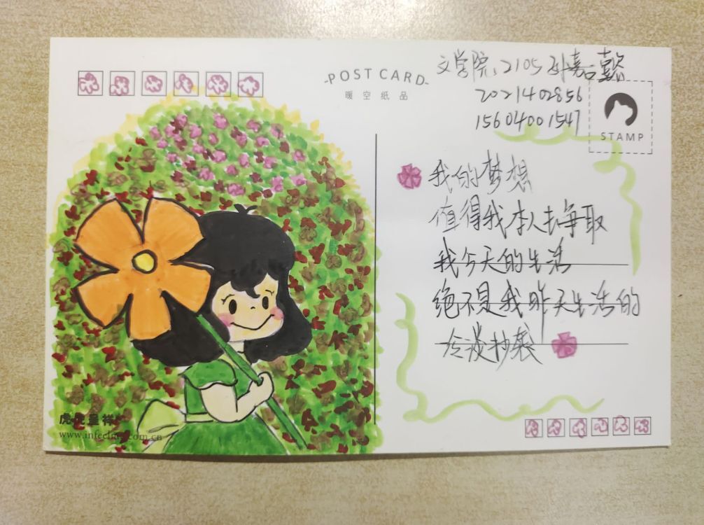 春意盎然青满树,书香校园求知路。本次书签设计比赛活动得到广大同学们的积极响应,通过制作书签或明信片的形式,表达对春日读书的期待和向往。杜金阳同学以水彩画的绘画方法,为大家呈现一副色调和谐、清新自然的画面,并配以“枯木逢春”的寄语,充分表达出对春日将至的向往。孙嘉懿同学以翠绿为主调,灵动的画法使卡通风格人物跃然于纸上,并以追寻梦想的文字加以修饰,突出对公司读书生活的期望,展现出其对校园生活的热爱。同学们融情于笔,抒情于画,不仅仅是对春日到来的热切情感,更展现沉浸于书香校园的学子风度。