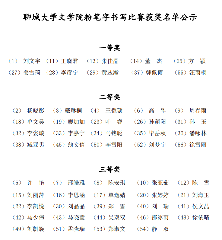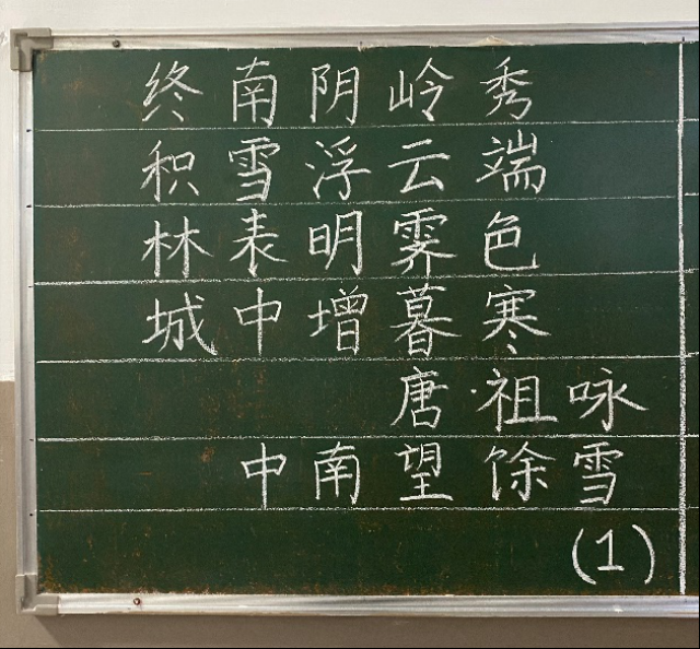 本次比赛以班级为单位进行初赛,从中推选出作品优秀的同学进入决赛。比赛采用现场板书的形式进行,板书内容统一,选自唐代诗人祖咏的《终南望余雪》:“终南阴岭秀,积雪浮云端。林表明霁色,城中增暮寒。”冬日恰逢暮寒,别是一番滋味,此情此景,此诗此意,相辅相成。比赛开始指令发出后,同学们站在各自的黑板位置前笔走龙蛇,他们目光专注地注视板面,灵动的手指写下一个个娟秀灵动的字,落笔如云烟,观其力而不失,身姿展而不夸,笔迹行云流水,给人以美的享受,在一笔一划的书写中感受作为人民教师应当必备的责任与担当。在所有同学书写完成后,老师对作品进行专业打分,分别评出一二三等奖。王晓君的书法行云流水、气势磅礴;翁文倩的字体娟秀端庄、流美疏朗;臧亚男的作品鸢飘风泊、灵动优美。书到深处见文化,书到极致见精神。每位参赛选手都以一丝不苟的态度纵横在撇、捺之时,行走于横、竖之间。老师们认真仔细地筛选参赛作品,最后评选出优秀作品一等奖10名,二等奖20名,三等奖24名,并将获奖名单公示。