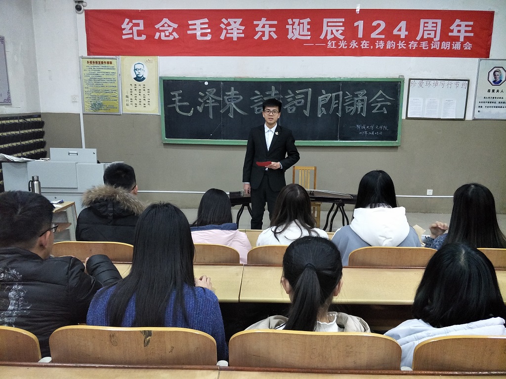 红光永在,诗韵长存。为纪念毛泽东诞辰124周年,12月25日,beats365唯一官网入口官网于西校区3#c325举办毛泽东诗词朗诵会。本次活动由优秀员工王子佳、刘润林、张雪等人担任评委,段博涵担任主持人。2016级、2017级三十余位同学报名参加。
