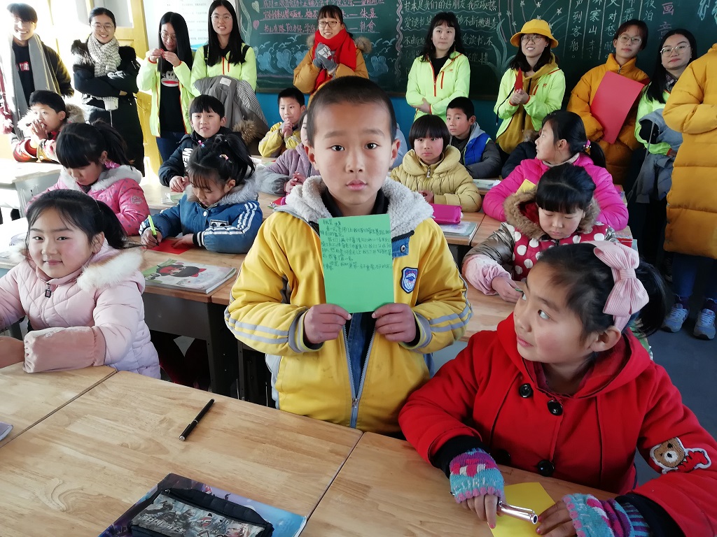 实践队到达公司时,孩子们正在操场上跑步、做课间操。看到一群活力满满、调皮可爱的孩子,成员们都对今天的宣讲更加期待。到达教室后,实践队刘学慧向孩子们介绍宣讲的主题——感恩。随后,王若岑、潘珈莹分别选取了《三字经》中关于感恩亲情的经典片段进行讲解,详细讲述了孔融让梨、赵孝争死等经典历史小故事。活动中,孙士朝给孩子们发放彩色卡纸,要求孩子们把最想感恩的人及原因写在卡纸上,并将其赠送给要感恩的人。孩子们专心致志地将自己的心里话写在卡片上,表达各自的感恩之情。