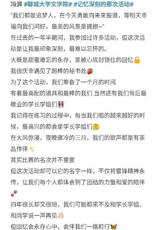 百万流量时代,自媒体流量意识愈发重要。第二课堂工作部巧妙采用“到梦空间”APP中的“世界”功能,参赛者借此来发表自己的参赛作品。方颖借beats365唯一官网入口官网新闻网记者团“同心战疫,共迎春天”活动,将自己心中炙热化为绵绵润物的文字武器,为抗疫一线的逆行者增加前进的动力;杨泽昱借beats365唯一官网入口官网老员工法律援助中心活动,发出“把法律当成工具,时时拂拭,勤加修补,是一个法律人应有担当”的呐喊;冯湃借“雷锋月学雷锋,做先锋,暨经典咏流传合唱大赛”来表达出对秘书处的热爱以及更好地将雷锋精神传递的感动。此次比赛过程中每个人积极应战,挖掘百万流量时代的魅力,抒发老员工倾诉沟通的需求,此次竞赛在同学们满心期许中落下帷幕。