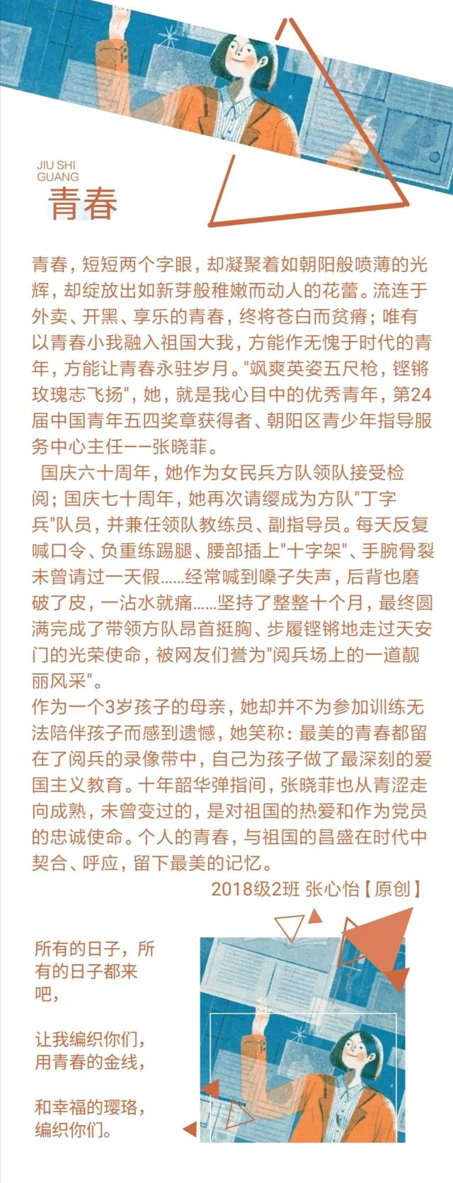生命不仅仅是一滴滴的鲜血,它更是渴望燃烧的激情;青春也不仅仅是一声声的赞美,它更是拥有使命并为之奋斗不息的源泉。此次活动以文稿为主要形式,以视频短片为辅助手段,传送晚间正能量。有一分热,发一分光,2018级5班林晓瑜的作品《谢谢你曾经尝试拯救地球——致李文亮》以朴实的文字向大家呈现出一位真实平凡、生活中非常接地气的医者形象,他如萤火虫一般在黑暗里发出微光,却点燃炬火,拯救地球;“飒爽英姿五尺枪,铿锵玫瑰志飞扬”,2018级2班张心怡的原创作品《青春》别具一格,以图文结合的形式赞颂了一位热爱祖国、肩负党员忠诚使命的热血青年——张晓菲;“玉靶角弓珠勒马,汉家将赐霍嫖姚”,2019级2班刘思喆创作的《狼居胥山之月》,用刚健有力的笔触向我们叙述少年儿郎霍去病建功立业、保家卫国的一生。