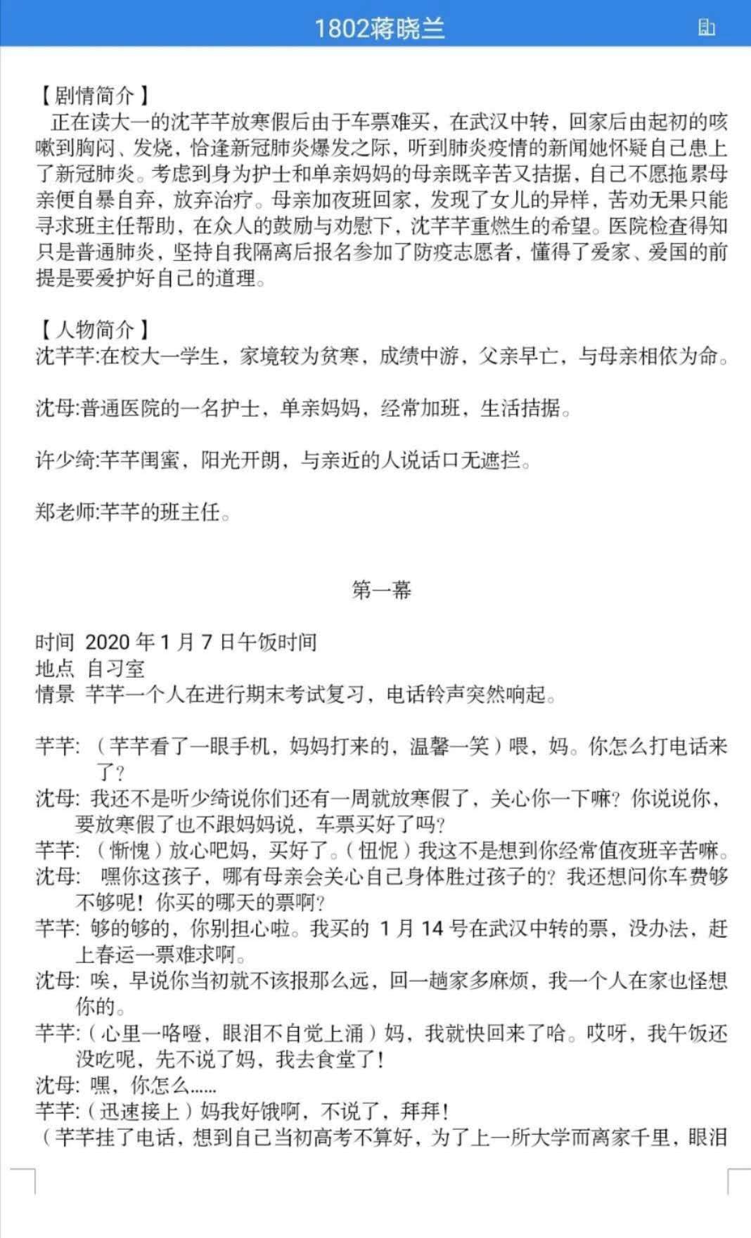 别样角度看生活,生活处处精彩。活动一经宣传便得到积极响应,同学们纷纷发挥脑力,将萦绕心间的思绪,落到笔上变成剧本,用最直接的方式将其抒发出来,参与热情极高。一个个内容生动且富有创意的作品,令评委们叹为观止,其中蒋晓兰的《我爱我,我爱我们》结合新冠肺炎爆发这一时代背景,将人间真情表现的淋漓尽致,点明了爱国爱家的前提是要爱护好自己的道理;刘紫叶的作品贴近生活,情节环环相扣,引导同学们摆正心态,正确认识并树立正确消费观,理性消费。活动后期,评委们秉承公平公正的原则对同学们的作品进行评审,最终选拔出多个优秀作品,并分别颁发一二三等奖,本次活动圆满落下帷幕。