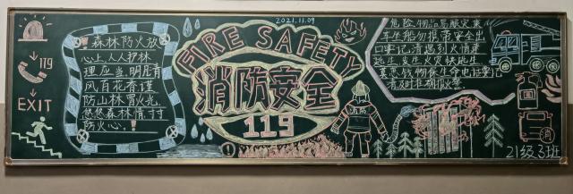 活动前期,同学们认真准备,分组讨论,细致耐心地完成组内黑板报。学习发展部志愿者仔细筛选板报成品,评选出具有代表性的作品。2021级2班同学在其黑板报作品中用拟人的绘画方式表现出“119”的可爱形象,配文言简意赅,巧妙突出消防安全的板报主题;2021级11班的黑板报作品灵活地使用“葫芦娃”的漫画形象,提醒同学们遭遇火灾时随时注意安全。2021级3班黑板报作品整洁大方,字体工整,罗列多条消防安全知识,进一步加深同学们对消防安全知识的理解与认识。2021级6班黑板报作品整体布局和谐美观,注重强调森林火灾预防的重要性。此外,还有许多形式多样、生动有趣的黑板报优秀作品。
