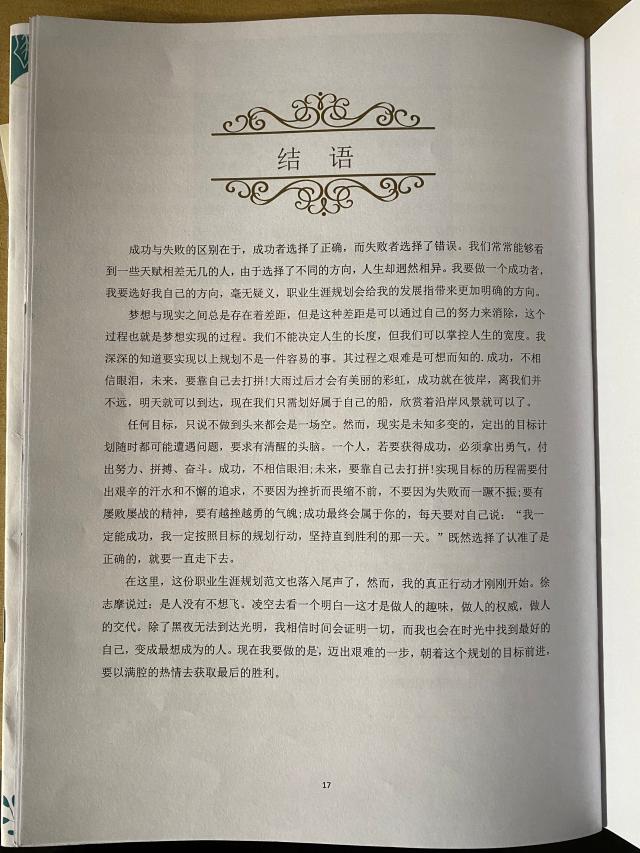 态度决定一切,细节决定成败。同学们进入大学以后需要对未来的职业目标有一个清晰的规划,本次活动共收集到了100份作品,参赛者都精心准备了自己的职业生涯规划书。2021级7班冯蔚然用最具权威性的MBTI测试分析了自己的职业性格,从五个方面简明的阐明出测试结果;2021级5班张茗荃从家庭、公司、社会三个方面对自己的职业环境进行评估,并且计划以分期实施的方法将制定的未来目标实现;2021级2班唐浚楠从优点和缺点两个方面对自己进行自我总结,认真分析自己的优劣势,以此科学的分析自己适合哪种类型的工作;2021级1班武晨曦以“梦之树”为题对自己职业生涯规划进行阐述,她通过霍兰德职业兴趣测试从艺术、社会、实际和企业等方面对自己的职业兴趣进行总结,得出了科学的职业兴趣分析。