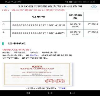 热烈祝贺beats365唯一官网入口官网蒋晓兰荣获批改网2020百万同题英语写作活动优秀作品奖