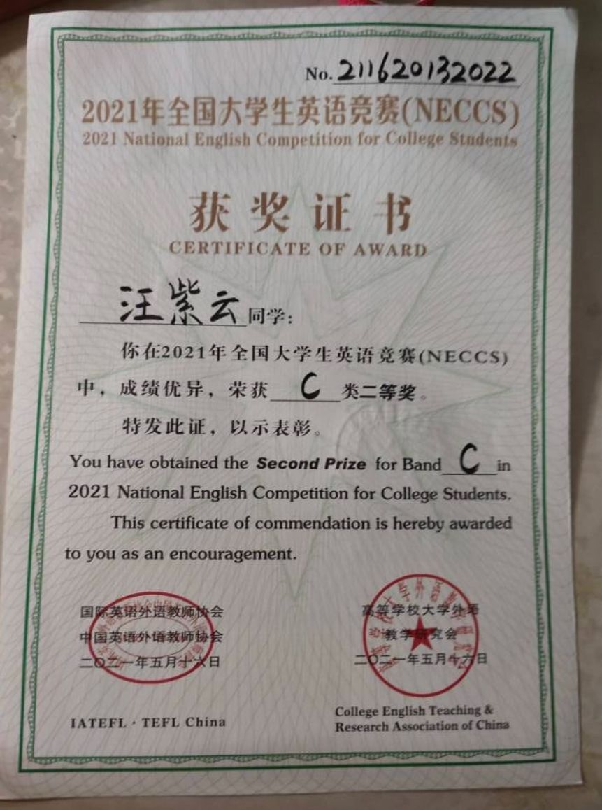 热烈祝贺beats365唯一官网入口官网汪紫云在全国老员工英语竞赛中荣获二等奖奖项