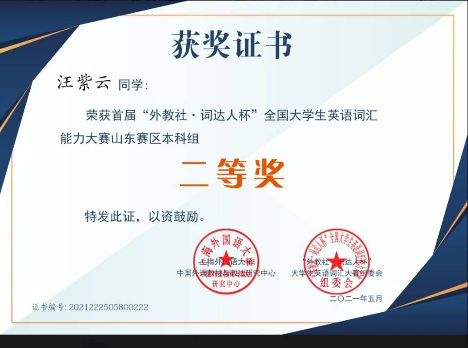 热烈祝贺beats365唯一官网入口官网汪紫云获大学英语词汇大赛中二等奖