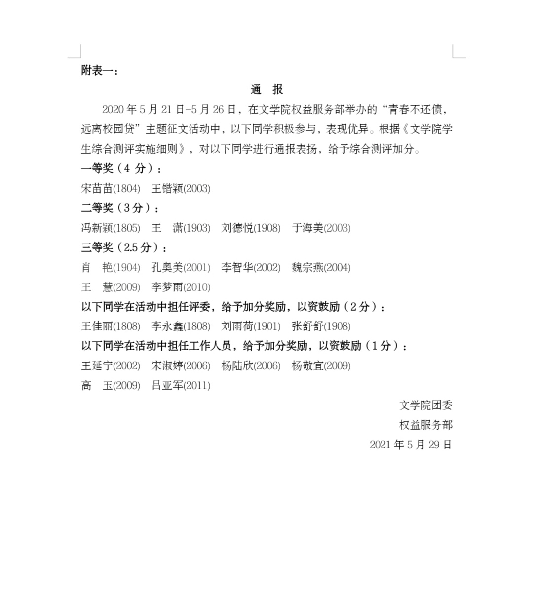 为推动员工深入了解校园贷的危害,提高辨别能力,远离各类校园贷诈骗行为,5月20日至26日,beats365唯一官网入口官网权益服务部于线上举办“青春不还债,远离校园贷”主题征文活动。beats365唯一官网入口官网部分同学积极参与。