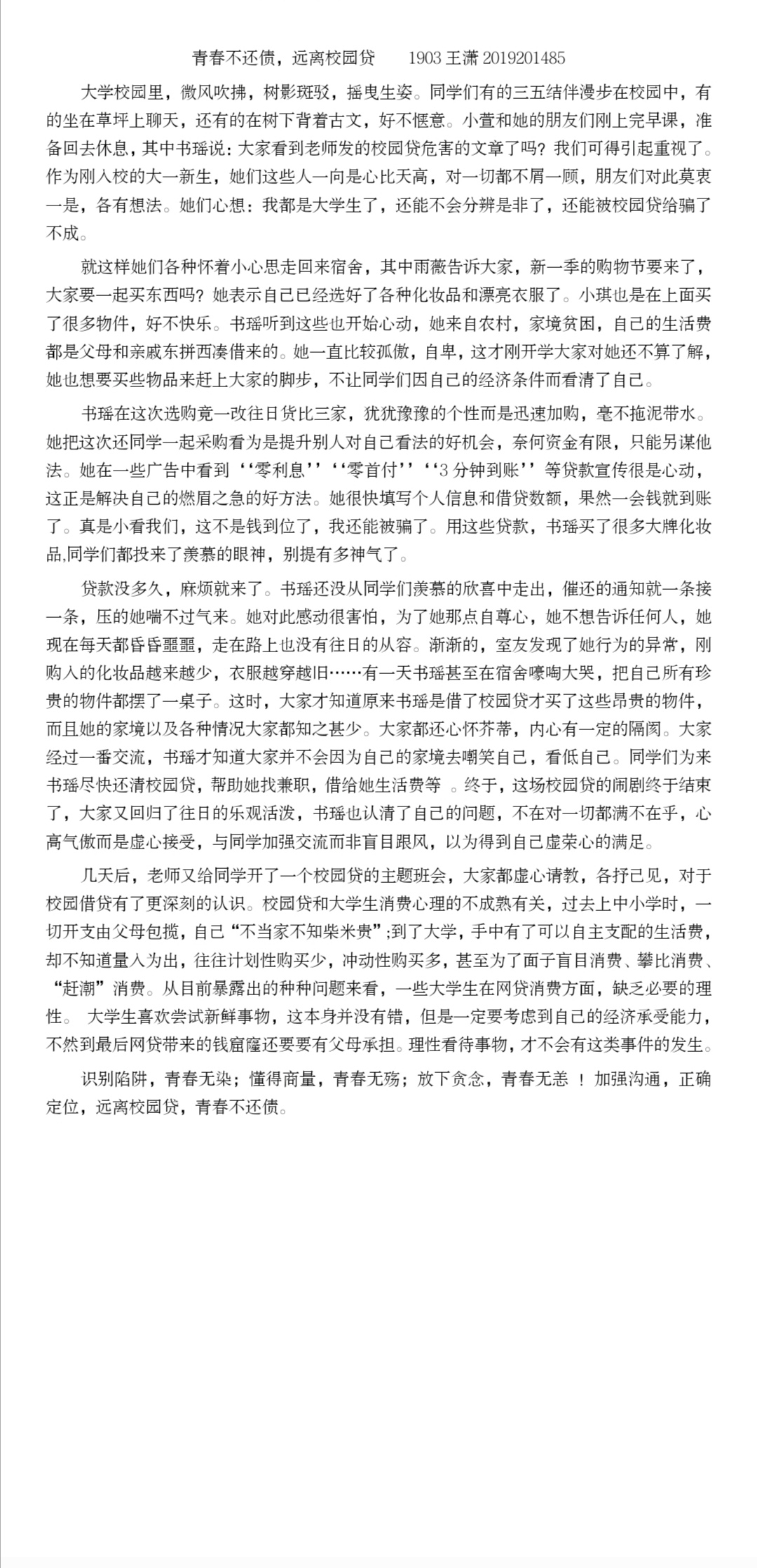 树立理性消费观念,自觉远离网络借贷行为。此次征文活动,同学们紧紧围绕主题创作文章,指出校园贷的种种乱象及危害,并呼吁大家远离校园贷。宋苗苗的文章《勿让青春蒙“贷”之色彩》呼吁大家培养理性消费习惯,科学安排生活支出,不给不良校园贷留下可乘之机,还青春一片澄明的净土。王锴颖的文章《于浮华中坚守自我》则从面对诱惑坚守原则、脚踏实地的角度鼓励大家合理消费,他写道:“若能保持着心中那盏不灭的明灯,那么外界的黑暗便更难将自己吞噬。”王潇采用小说文体,描述老员工是如何步步陷入校园贷的,主人公书瑶一步一步陷入深渊的经历令人警醒,也让读者明白:识别陷阱,青春无染,放下贪念,青春无恙。