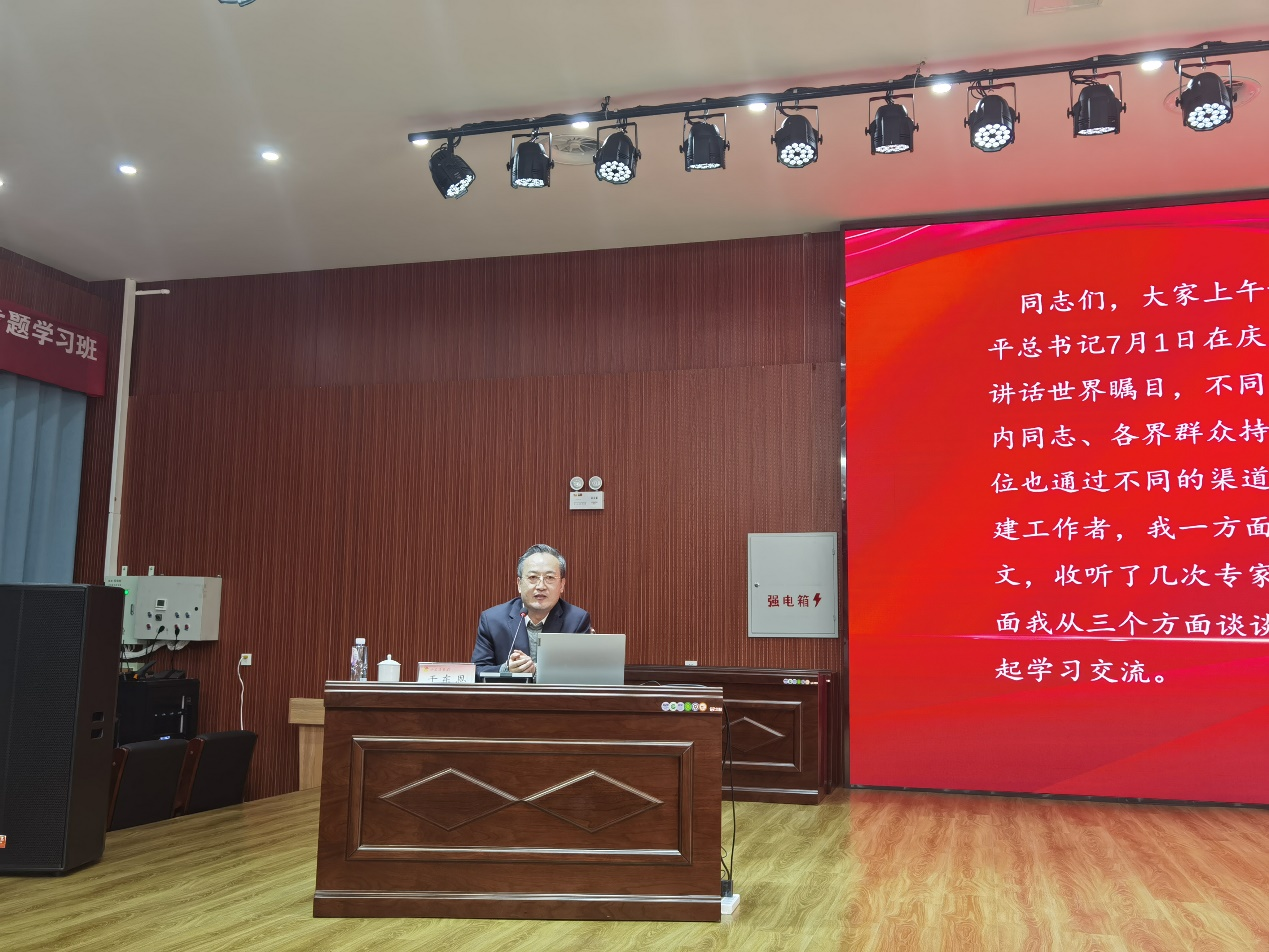 于东恩老师党课题目是“学习贯彻习近平总书记‘七一’重要讲话精神,做坚定的青年马克思主义者”。内容分三个部分:一是回顾历史:全面认识党的丰功伟绩、伟大光荣,热爱党、崇敬党;二是正视现实:深刻理解把握国际国内大势,坚决拥护党的统一领导;三是展望未来:致力于中华民族伟大复兴,做坚定的青年马克思主义者。